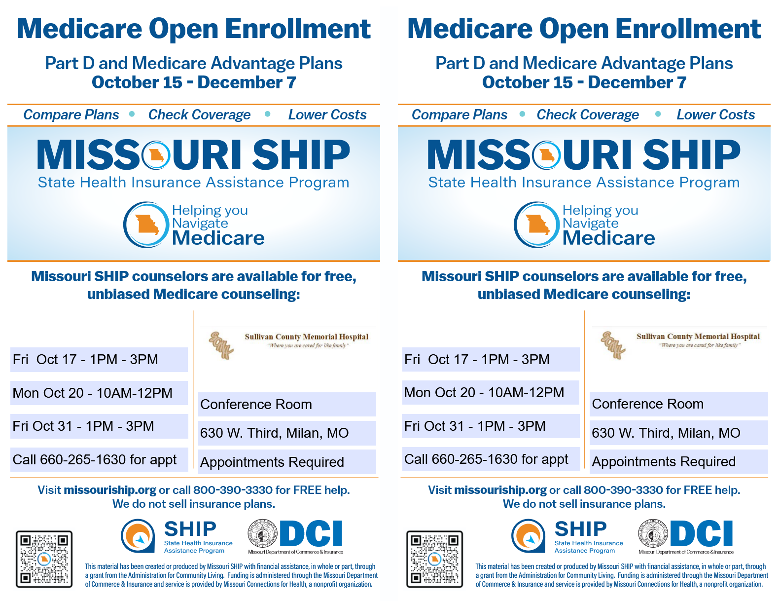 Sullivan County Memorial Hospital has a partnership with Missouri SHIP which allows you to make an appointment with them by calling 1-800-390-3330 or by clicking the MO SHIP button. A Sullivan County Memorial Hospital patient can make an appointment with Raelene Bailey, Missouri SHIP Counselor, by calling 1-660-265-1630. We encourage everyone to review their Medicare plan information annually, especially during Open Enrollment October 15th – December 7th each year.